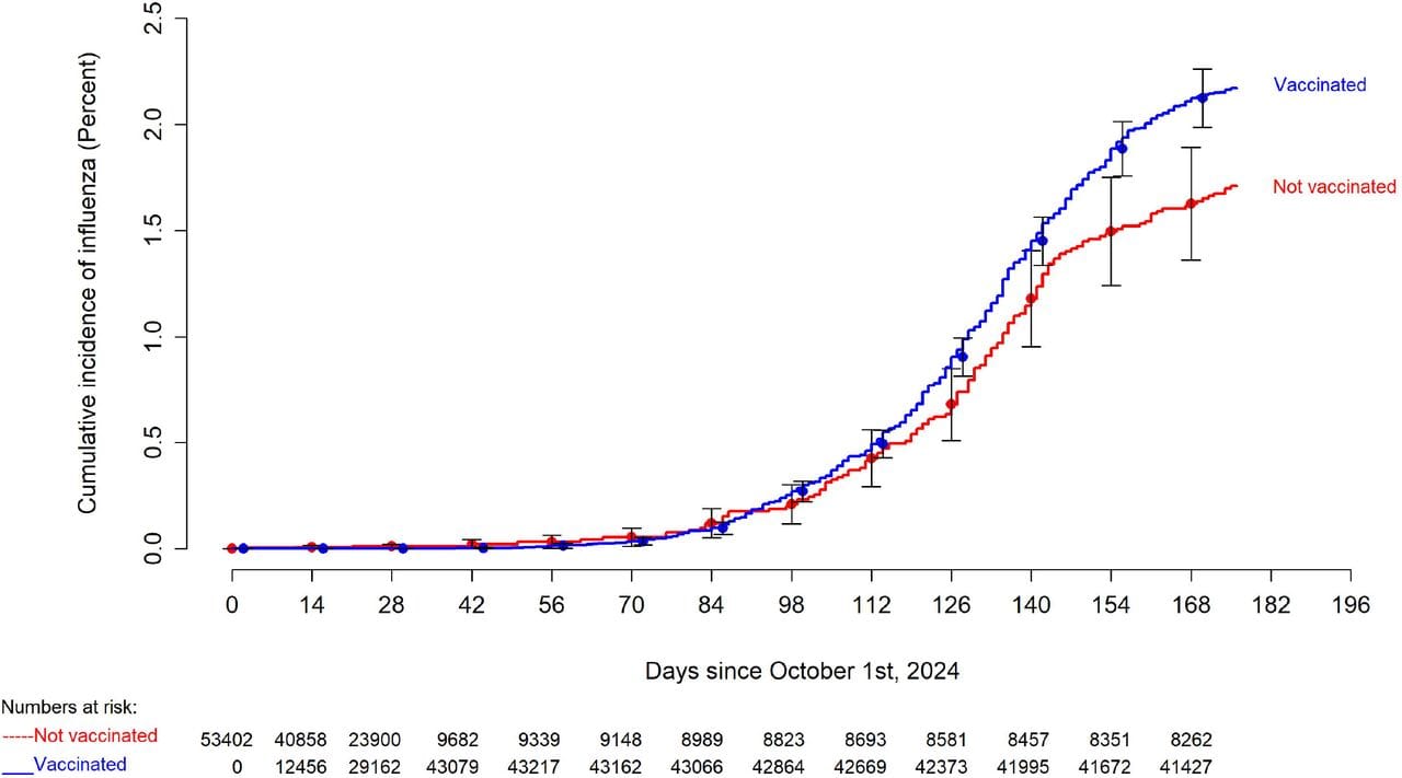 The study, which was published in April, looked at 53,402 employees at the Cleveland Clinic hospital network, with 43,857 (82.1%) having received the influenza vaccine by the end of the study. Based on the reported data, The cumulative incidence of influenza was similar for the vaccinated and unvaccinated cohorts in the early portions of the study however over the course of the study the cumulative incidence of influenza increased more rapidly among the vaccinated than the unvaccinated. When researchers adjusted for age, sex, clinical nursing job, and employment location, the risk of influenza was significantly higher for the vaccinated compared to the unvaccinated cohorts showing a significant negative efficacy of the vaccine.