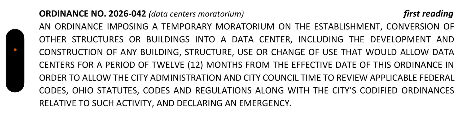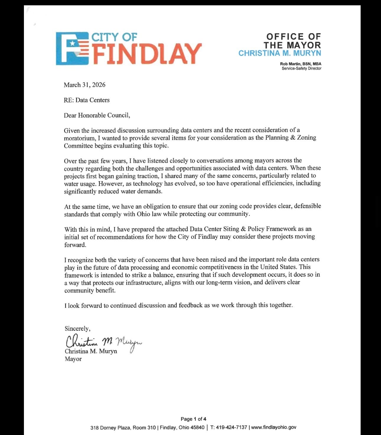 There was extensive discussion regarding a letter Mayor Christina Muryn included in the council packet outlining her ideas for regulating data centers. After some confusion, Councilwoman Kensinger motioned to move both the letter and new moratorium legislation to the Strategic Planning Committee. Several members of the administration, along with other council members, clarified that Planning and Zoning would be a more appropriate venue to discuss the mayor’s data center plan. Kensinger was also advised to separate the requests, leaving the data center moratorium legislation for a separate discussion.