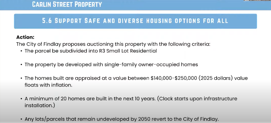 According to Mayor Christina Muryn’s presentation at the meeting, City of Findlay currently owns two parcels located on Carlin street in the West Park neighborhood. These properties are currently farm leased generating about $4,000 annually and were purchased in 2008 for $150,000 with the idea the public works department would put a shop on the property. The property is not recommended for the public works department given the lack of a central location which is critical for public works teams execution of their daily activities.