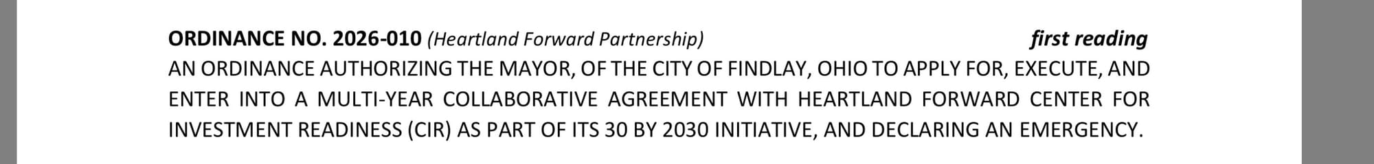 During the meeting, councilman Danny Delong questioned the need to suspend the rules of Ordinance 2026-010, authorizing the mayor to enter into a multi-year agreement with Heartland Forward for ‘investment readiness’ as part of the organizations‘ 30 by 2030’ initiative. Heartland Forward has a stated goal to bring 30 municipal areas in key middle-America territories to 'investment ready' status by 2030. The resolution did not state the benefit or need of the city to conduct this partnership, but rather emphasized its importance to Heartland Forward's endeavor.