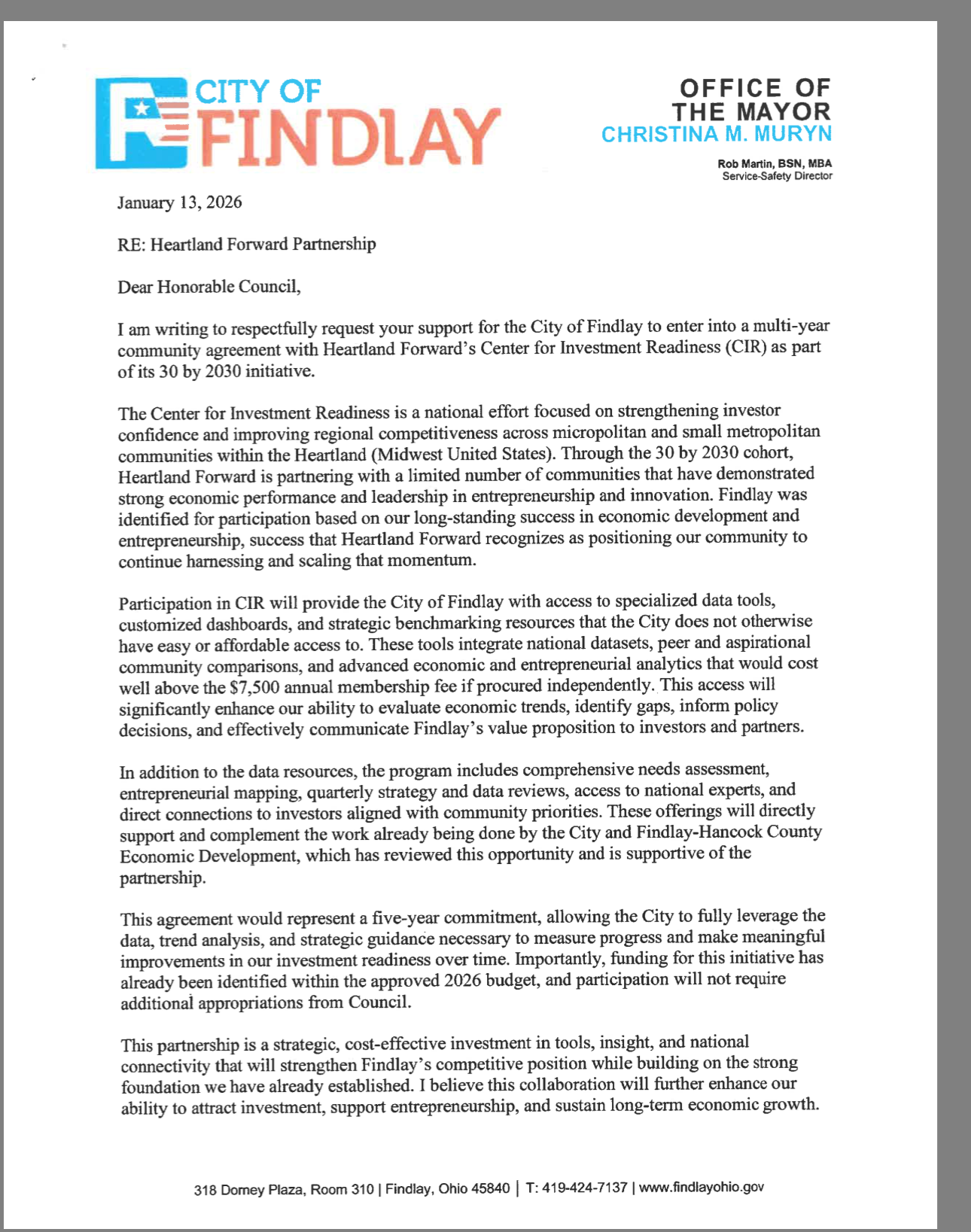 While Mayor Muryn's letter to council emphasized the importance of passing the resolution to help make Findlay 'investment ready' by 2030, much of how that is defined is shrouded in lofty words with circular explanations.