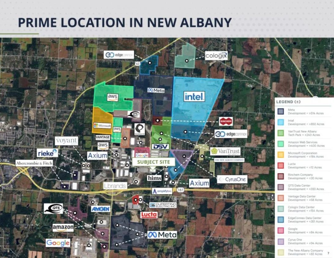 The business model was crystal clear from day one: privatize everything. The New Albany Company dictated land use. It strong-armed homeowners. It lobbied Columbus for zoning changes that funneled farmland straight into corporate development. Public government became a rubber stamp. Taxation, economic planning, and basic services were effectively handed over to private “techno-kings.” Population ballooned from about 1,500 in 1990 to around 11,000 today. The first data center arrived in 2014. Now New Albany hosts the world’s highest-capacity Meta facility and anchors the so-called Silicon Heartland — a sprawling complex of hyperscale server farms for every major tech giant. Ohio is home to nearly 200 data centers, with almost half in New Albany.