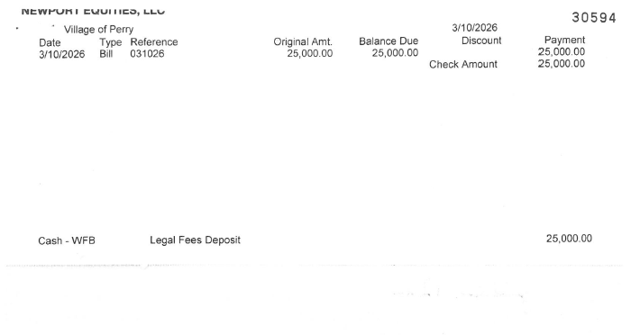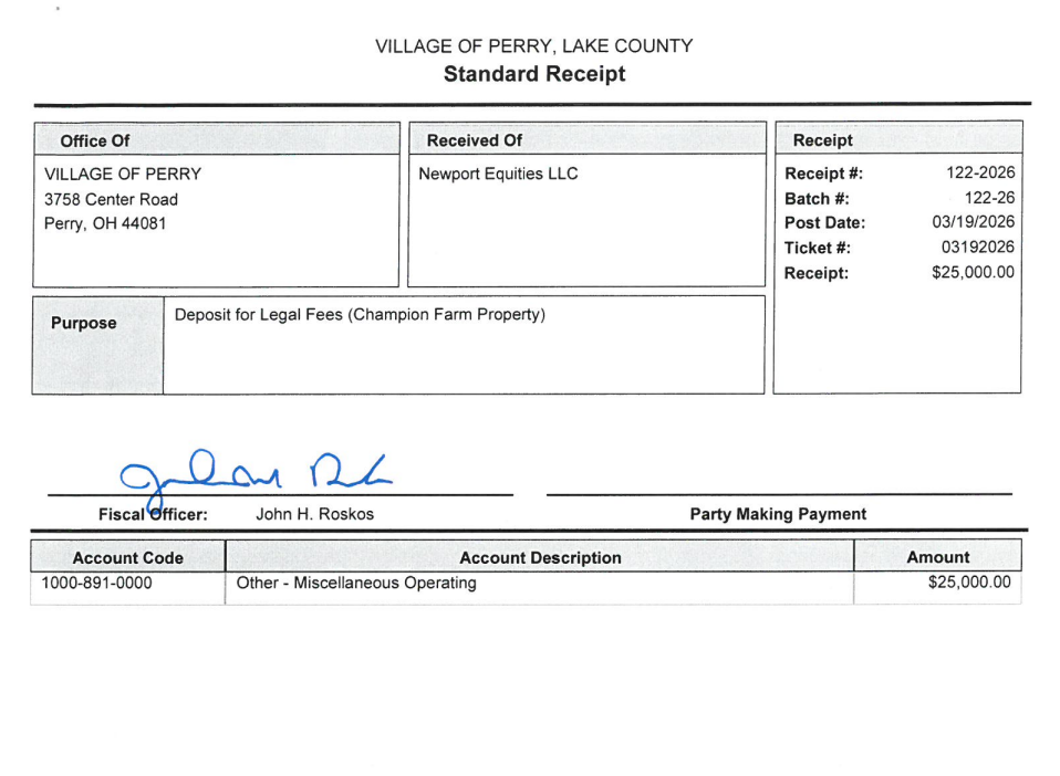 In a separate public records request, It was shown that Village Solicitor James O'Leary was compensated for his legal work in some regard related to work completed on the Newport deal. According to the village , "this deposit [is to] be used for legal fees incurred by the Village, who has engaged the services of Calfee, Halter & Griswold LLP specifically for counsel related to Economic Development matters. This firm is not in anyway associated with Village Solicitor James O'Leary."