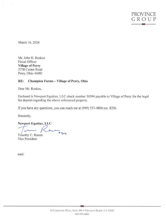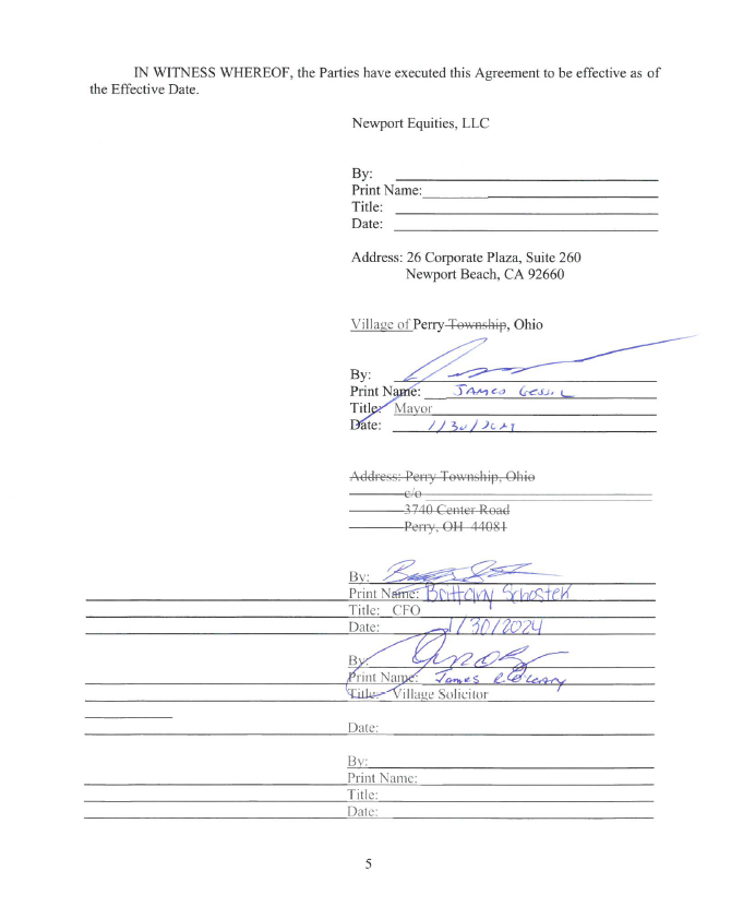 TOR has read through the document and provided it for public viewing below. After analyzing the document, some irregularities were noted, though some may not be uncommon for this specific type of deal, depending on where the deal was at the stage of this agreement's creation. It is evident based on the document that a similar or formatted template was used by Newport Equities LLC for use with Perry Township and Perry Village as multiple strikethroughs are present throughout where the Village name as an entity has been added.