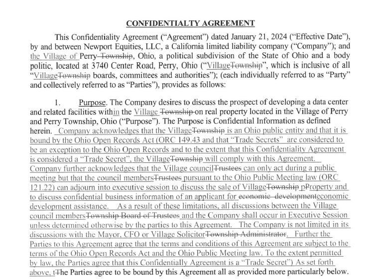 PERRY - After a public records request by The Ohio Register (TOR), The Village of Perry has released the nondisclosure agreement between the village mayor, James Gessic, and Newport Equities LLC, the legal arm of Province Group, developer at the heart of the data center controversy in the village.