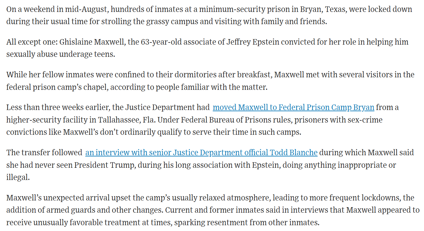 In August, Epstein and Les Wexner associate Ghislaine Maxwell was, without explanation, relocated to ‘club Fed’, the minimum security prison in Bryan Texas, while she is supposedly serving her 20 year sentence. The move required a special waiver to be completed as Federal Bureau of Prisons policy prohibits sex offenders like Maxwell to be transferred to minimum security prisons. Additionally, as a result of this move, Maxwell has been permitted a massive amount of leniency in allowed ‘work release’.