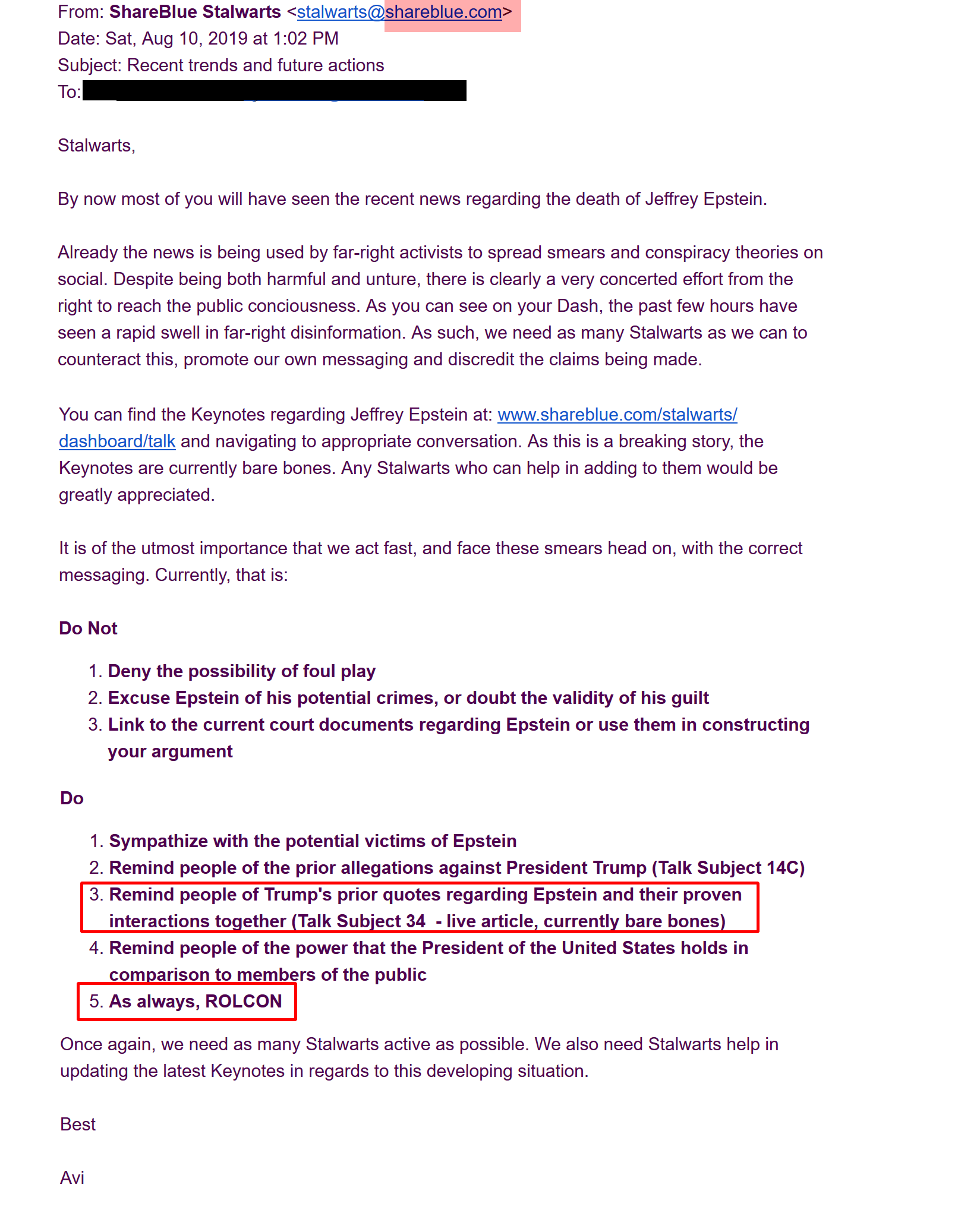 In 2019, ShareBlue is a progressive left media company run by David Brock, provided a list of 'Do's' and 'Don'ts' for keyboard activists to use in rhetoric to further push the idea that Trump was a client of Epstein's and may have been involved in Epstein's death in federal custody.