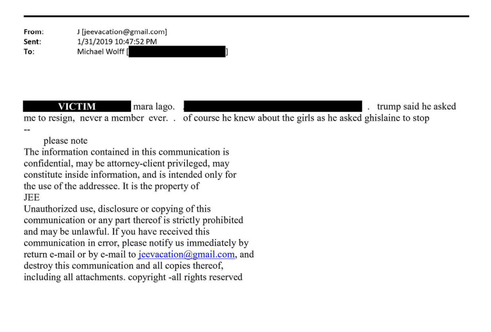 In the emails, Epstein communicates to Maxwell that Trump is a “Dog that has not barked”, implying he has not communicated to federal authorities what he knows, but obviously knows a great deal as he ‘has spent several hours’ with an unnamed victim. A later email released, also redacting victim identifying information, relates to the falling out of Epstein and Trump from an incident that occurred at Mar a Lago. Given the limited details available in the emails, it is a strong likelihood the victim in question is the recently departed Virginia Giuffre. Giuffre was first introduced to the Epstein and Maxwell world through her time working at Mar a Lago as a spa attendant in the mid 2000s.