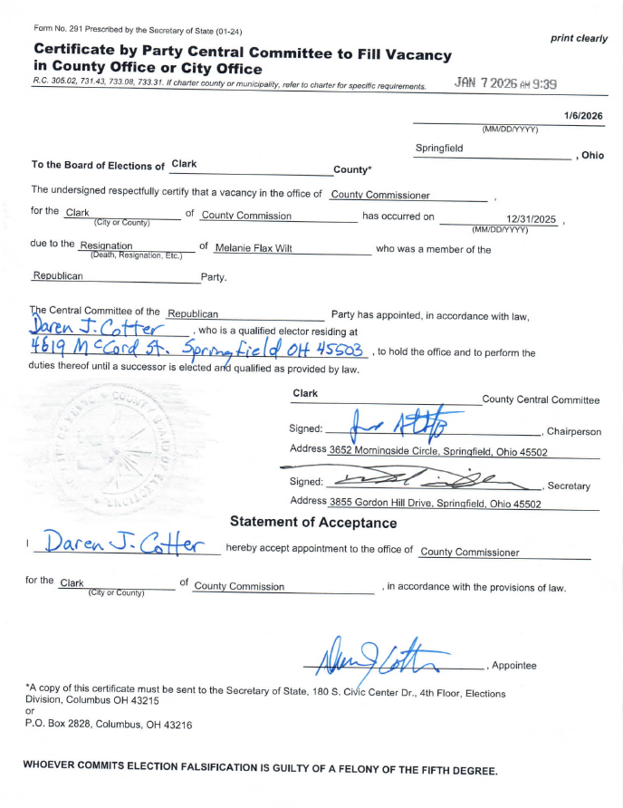 Both entities submitted their official form 291 to file for that appointment which now means the county and further the state will be in possession of 2 separate forms for two different candidates for the same seat, one from the 'Clark County Republican Party Central and Executive Committee' and one from 'The Republican Party of Clark County'.