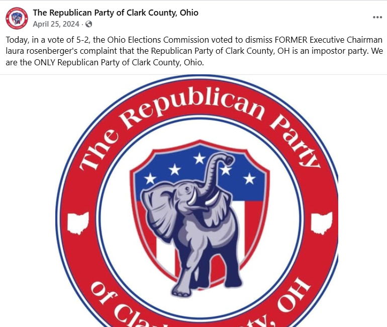 The breakaway faction, now naming themselves The Republican Party of Clark County and registering the name through the State, led by previous chair Jim Stickford, claimed they held the right to vote to oust their leaders due to legitimate concerns in 2023. The end result has been effectively two separate entities both claiming legitimacy within the county and ongoing legal battles with no clear, distinct victor. In 2024 a case brought by Rosenberger against 'The Republican Party of Clark County' to the Ohio Elections commission was dismissed by the judges who stated it was not up to them to determine who the true party is, Though this was claimed as a victory by The Republican Party of Clark County, both entities have continued to operate independently with no clear decision ever made by an authoritative body.